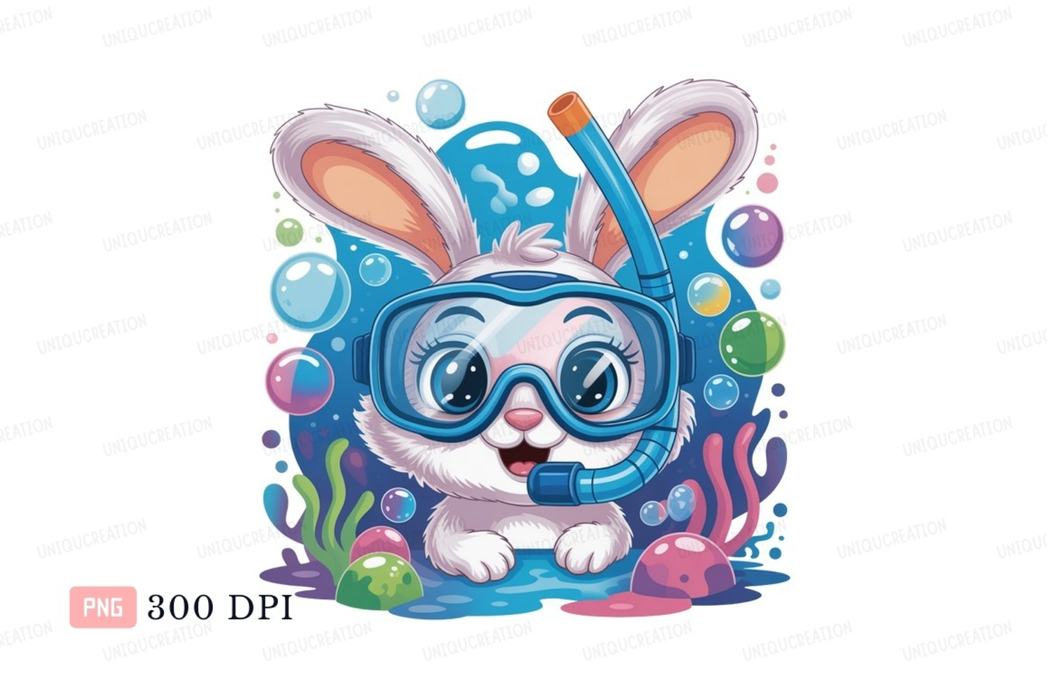 Fluffy bunny snorkeling underwater bubbles mask example image 1