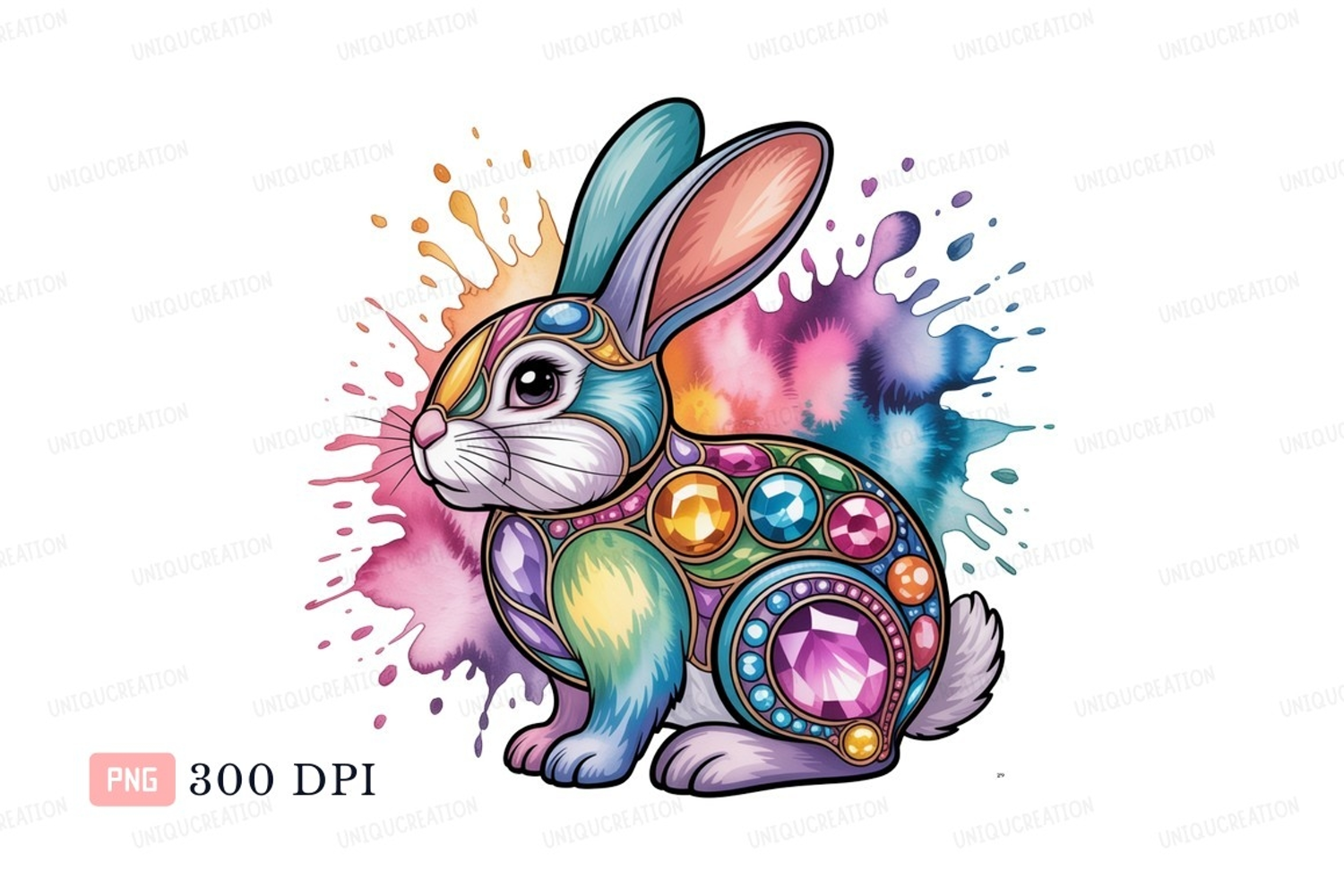 Colorful jeweled rabbit watercolor splashes bunny example image 1