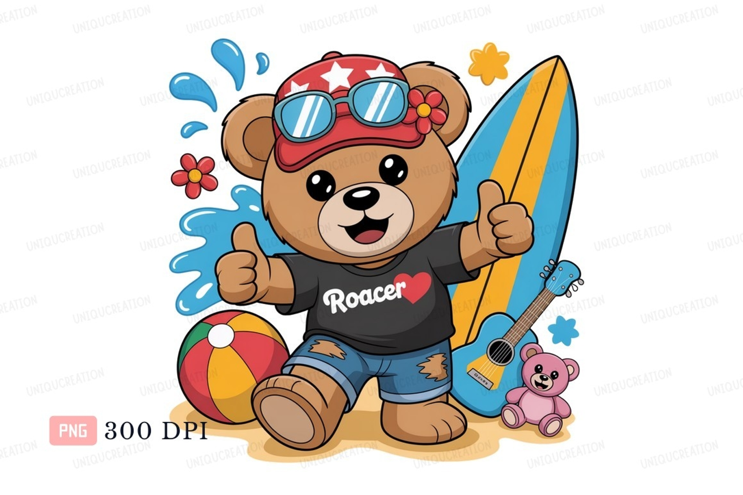 Cheerful bear with surfboard and guitar beach summer example image 1