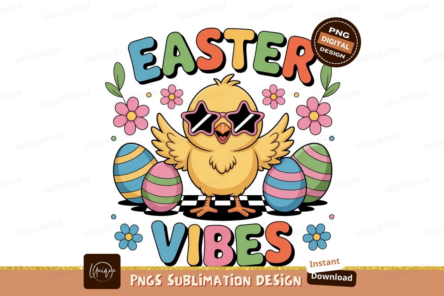 Chick wearing star sunglasses with easter eggs and flowers example image 1