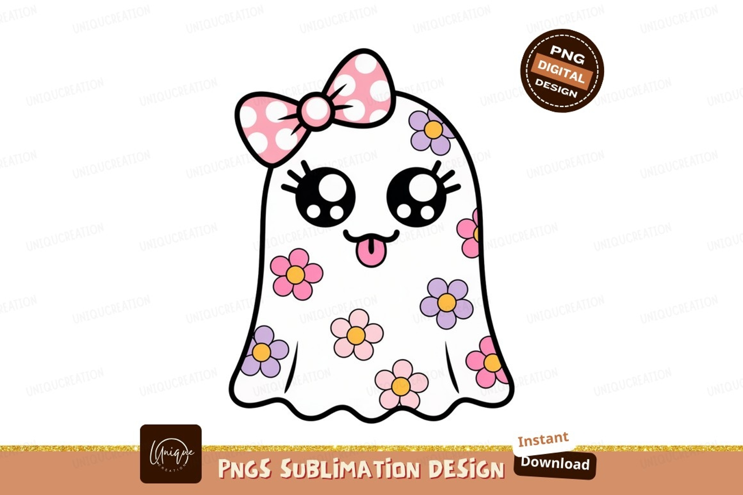 Cute ghost with flowers and bow kawaii example image 1