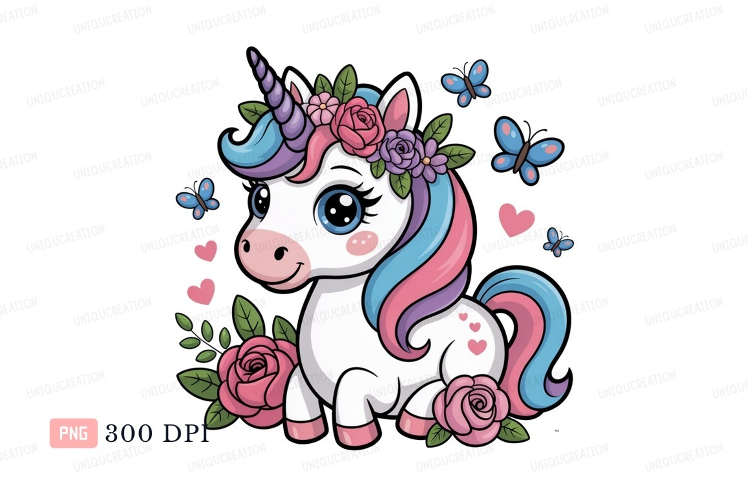Adorable unicorn surrounded by flowers and butterflies example image 1