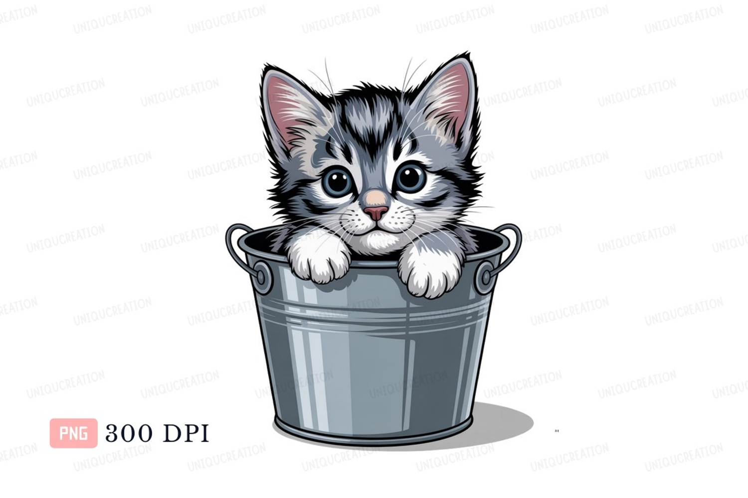 Similar Design Products to Gray kitten peeking from bucket white blue