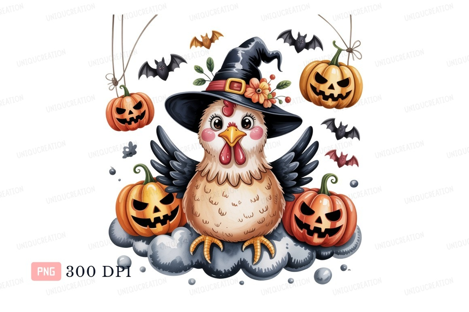 Halloween chicken witch with pumpkins bats CLIPART example image 1