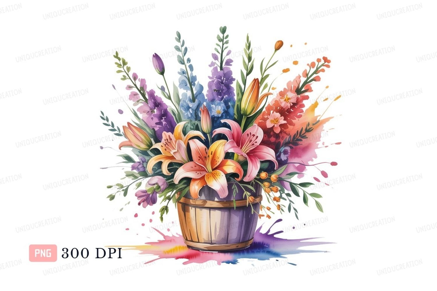 Similar Design Products to Colorful lilies and delphiniums in wooden bucket CLIPART