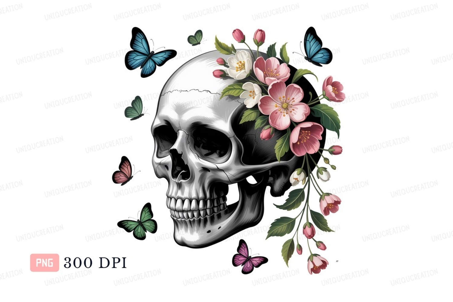Skull flowers butterflies pink white