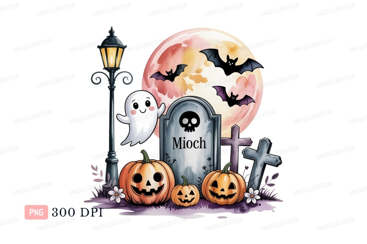 Spooky Halloween scene with ghost pumpkins bats moon example image 1