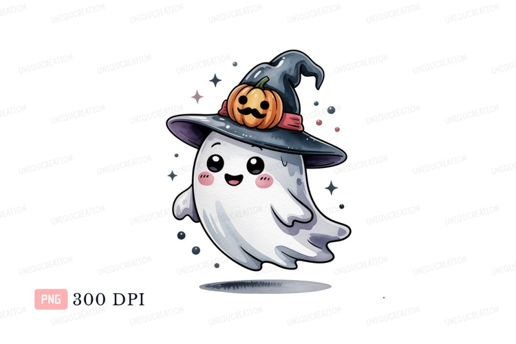 Cute ghost wearing witch hat and pumpkin halloween example image 1