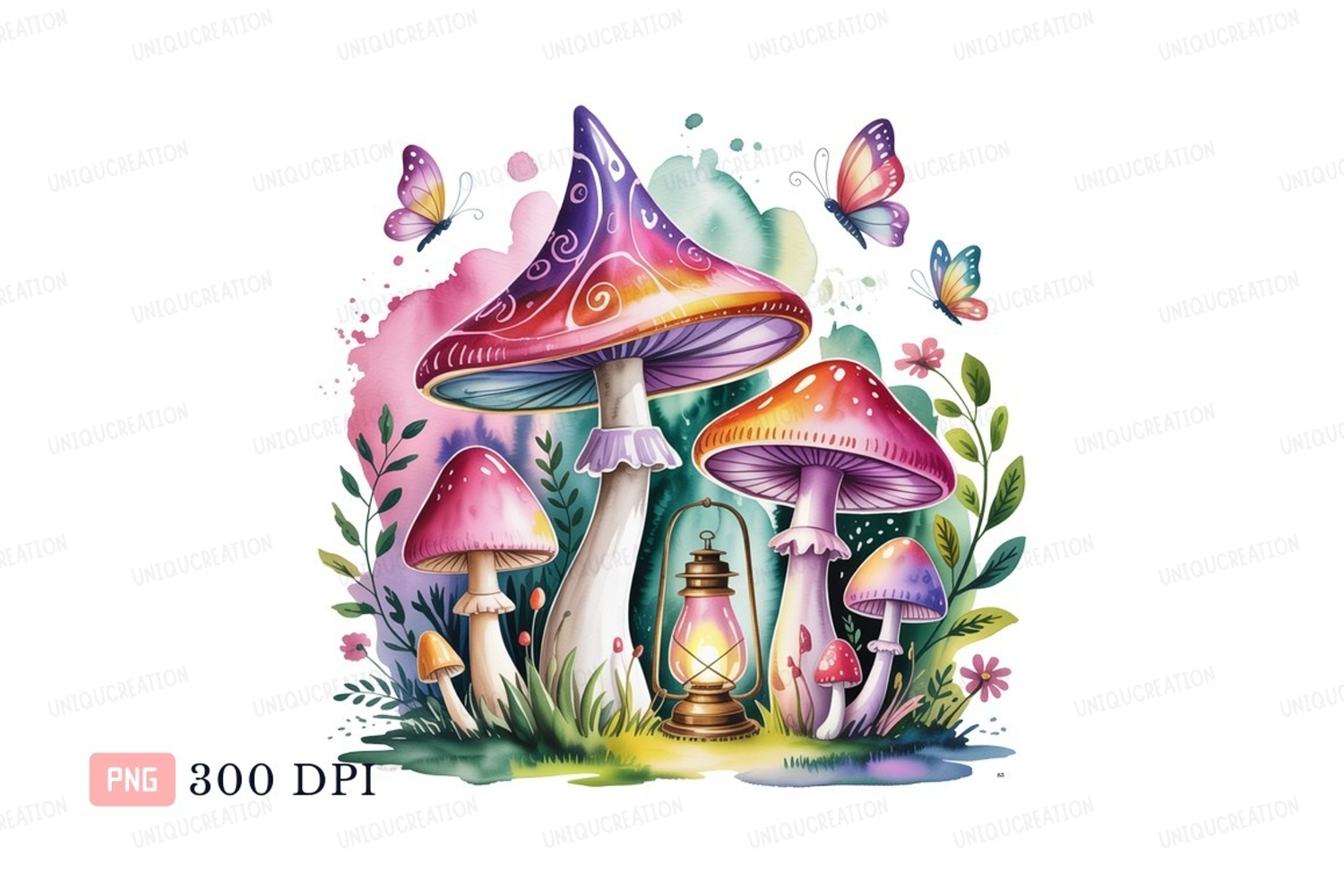 Illustration Fantasy Whimsical Nature Colorful Forest Mushrooms Magical Butterflies Lantern