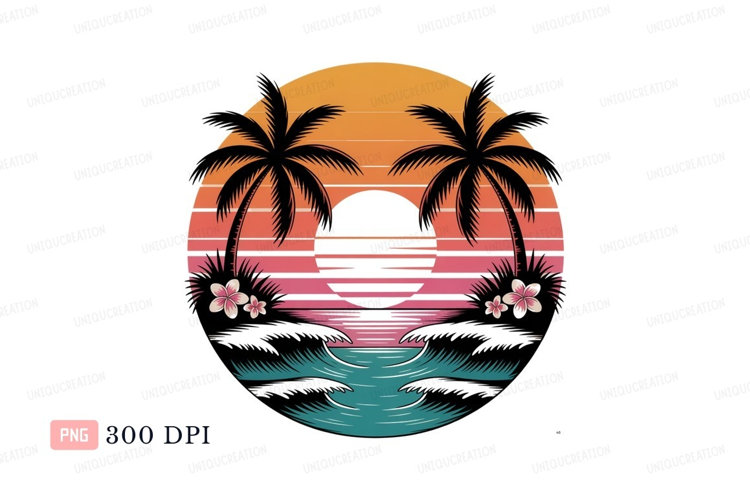 Retro Summer Ocean Beach Sunset Tropical Vacation Island Palms Waves
