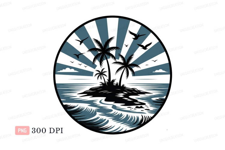 Tropical island sunset with palm trees and birds ocean example image 1