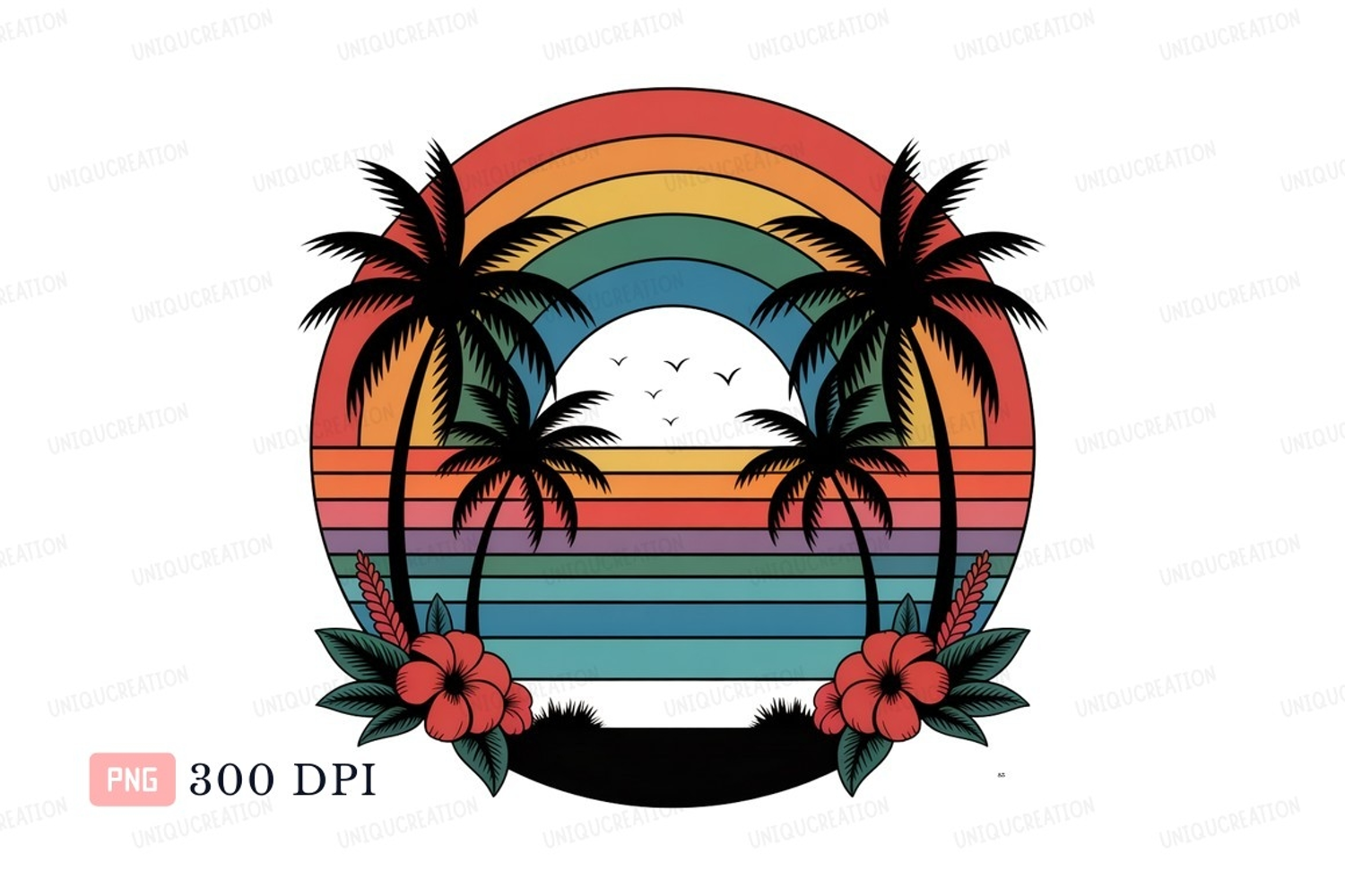 Vintage Retro Summer Flowers Beach Sunset Tropical Vacation Rainbow Palms