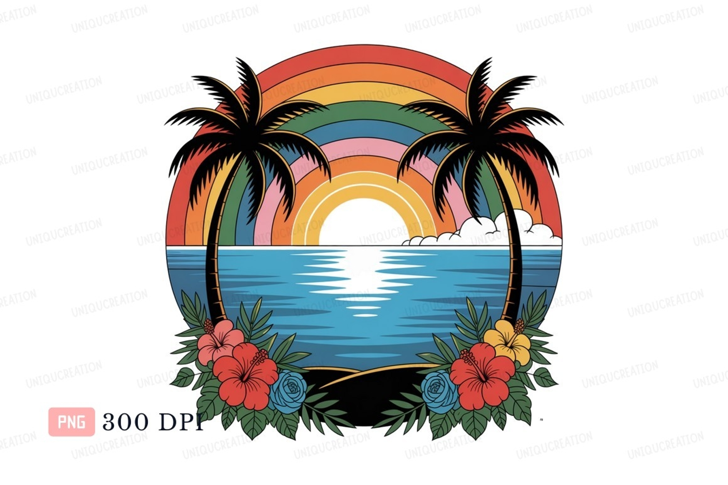 Ocean Flowers Leaves Sunset Blue Hibiscus Tropical Roses Rainbow Palms