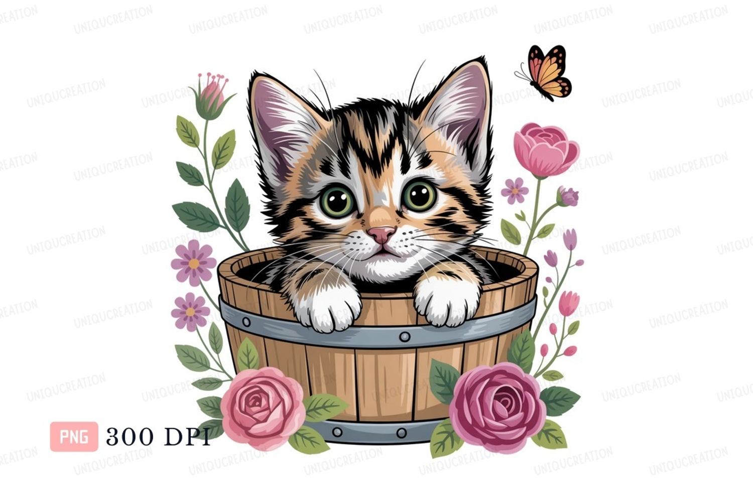 Similar Design Products to Kitten in wooden bucket surrounded by flowers image
