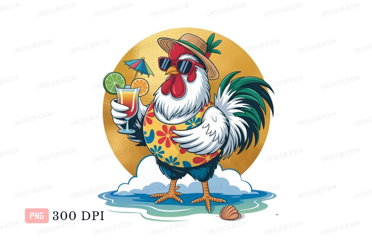 Rooster wearing hat sunglasses holding tropical drink example image 1