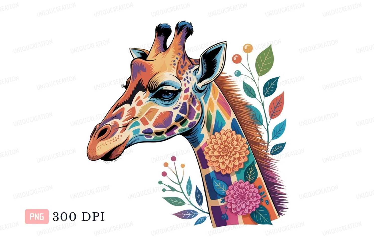 Similar Design Products to Colorful giraffe head adorned with flowers leaves