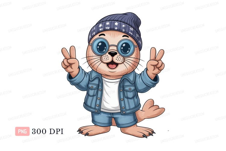 Cool seal wearing denim and beanie cartoon jacket example image 1