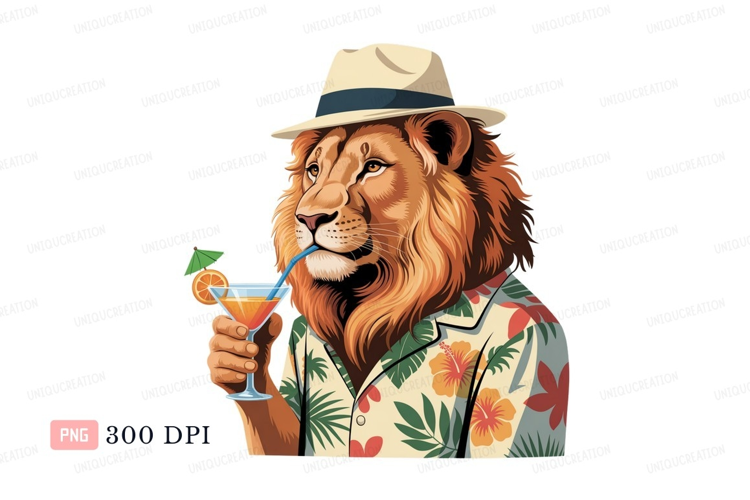 Lion wearing hat and floral shirt drinking cocktail example image 1