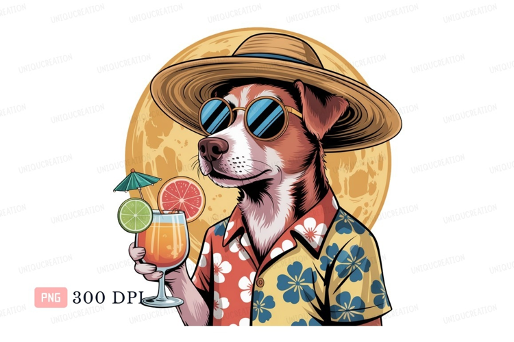 Dog wearing hat sunglasses holding tropical drink canine example image 1