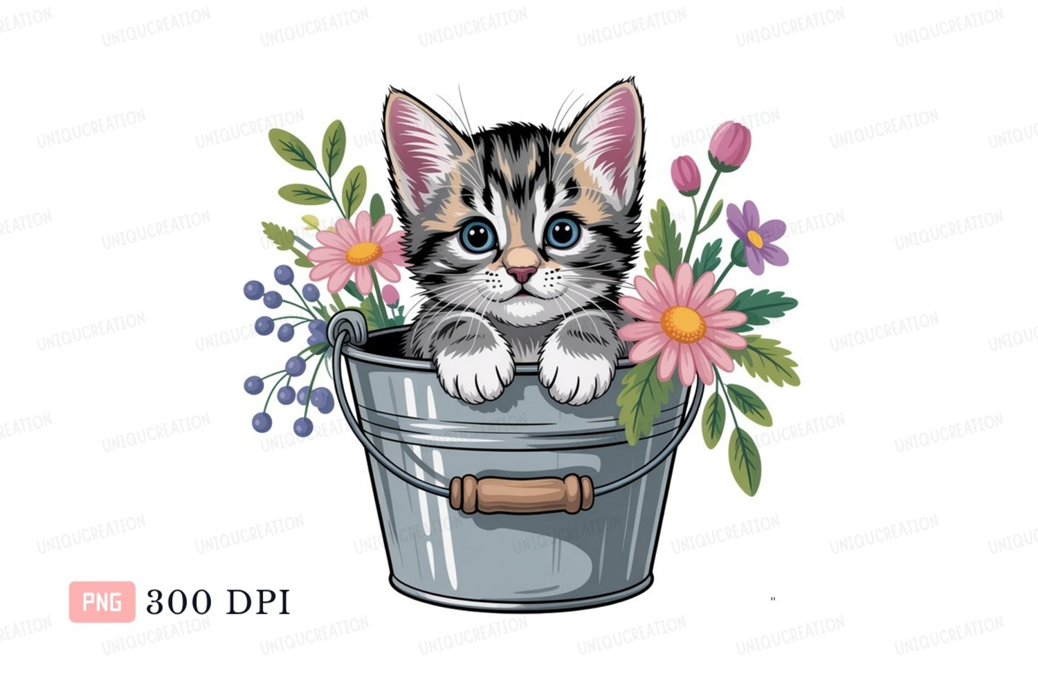 Cute Pink Green Flowers Blue Berries White Grey Kitten Bucket