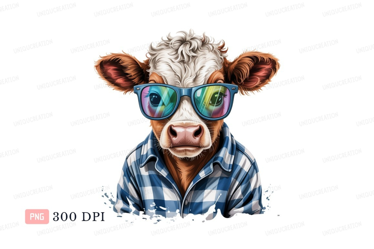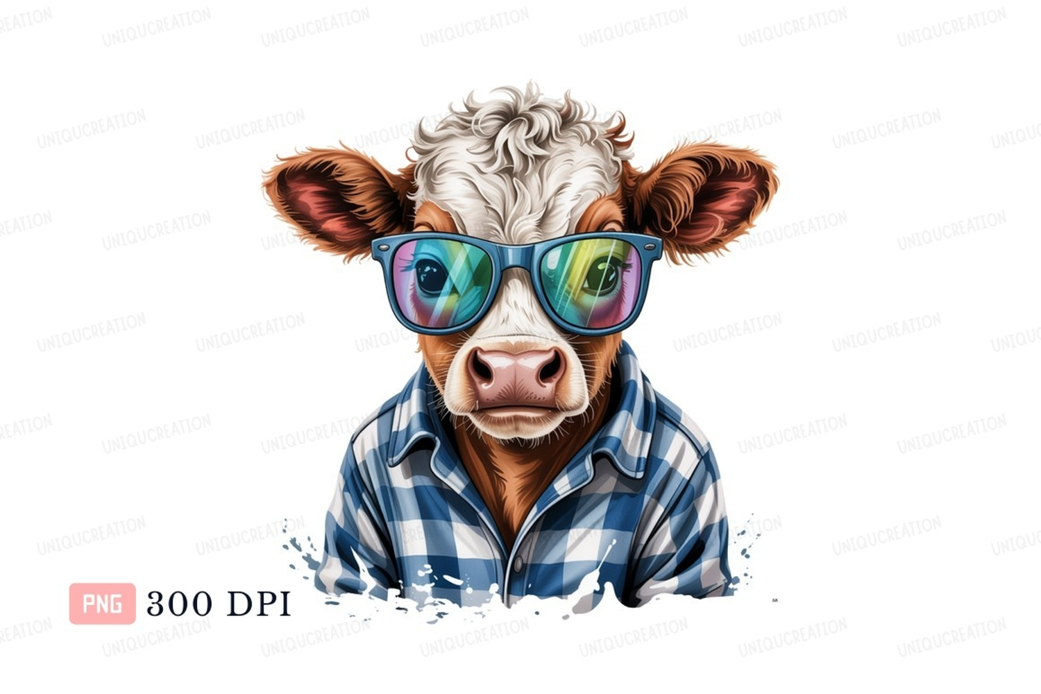 Cow wearing colorful sunglasses and plaid shirt animal example image 1