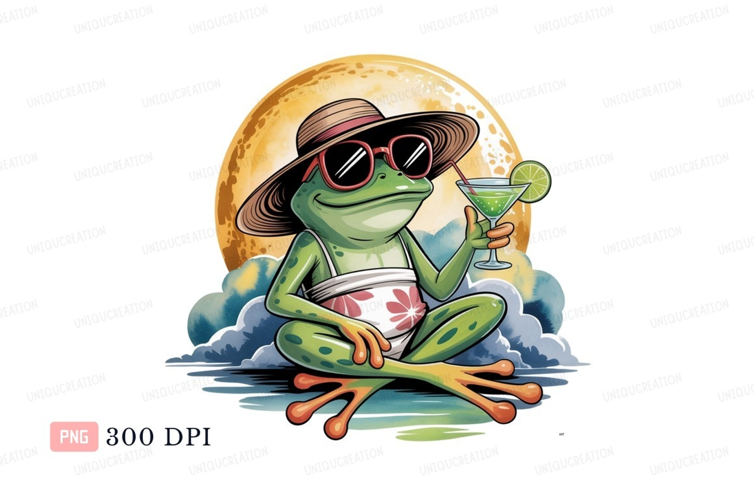 Green frog wearing hat and sunglasses with cocktail example image 1