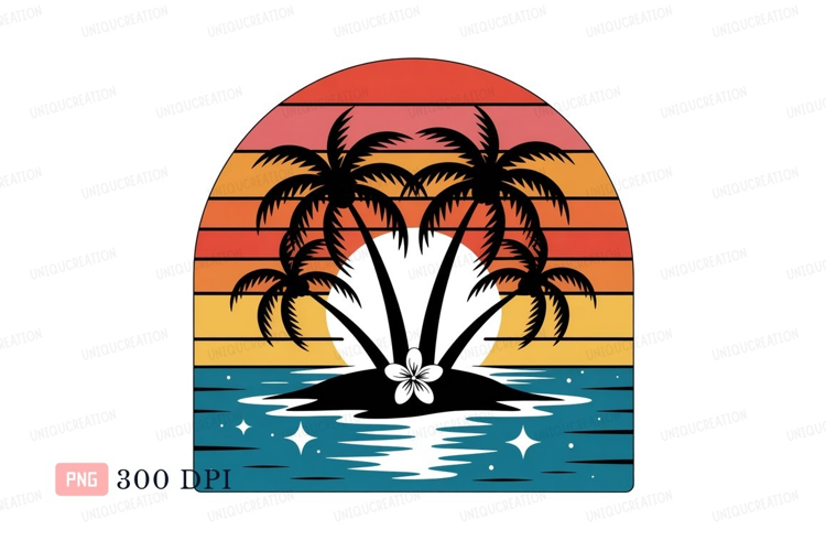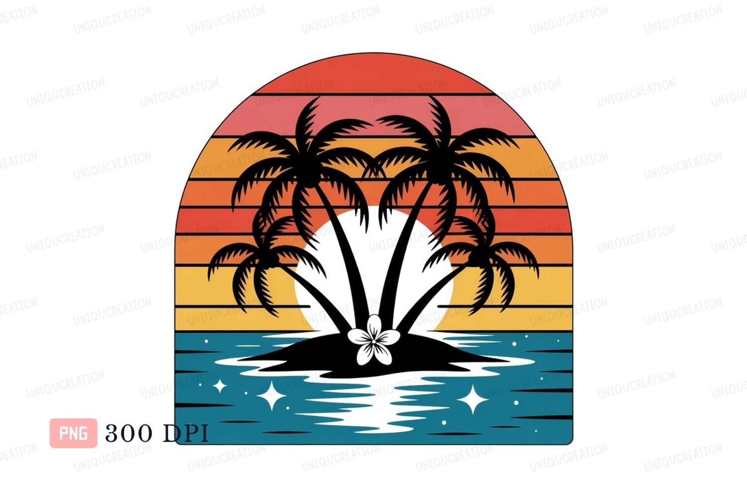 Vintage Retro Ocean Silhouette Beach Sunset Tropical Island Palms Reflection