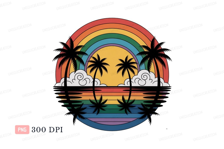 Retro Ocean Colorful Sunset Tropical Vibrant Rainbow Clouds Palms Reflection