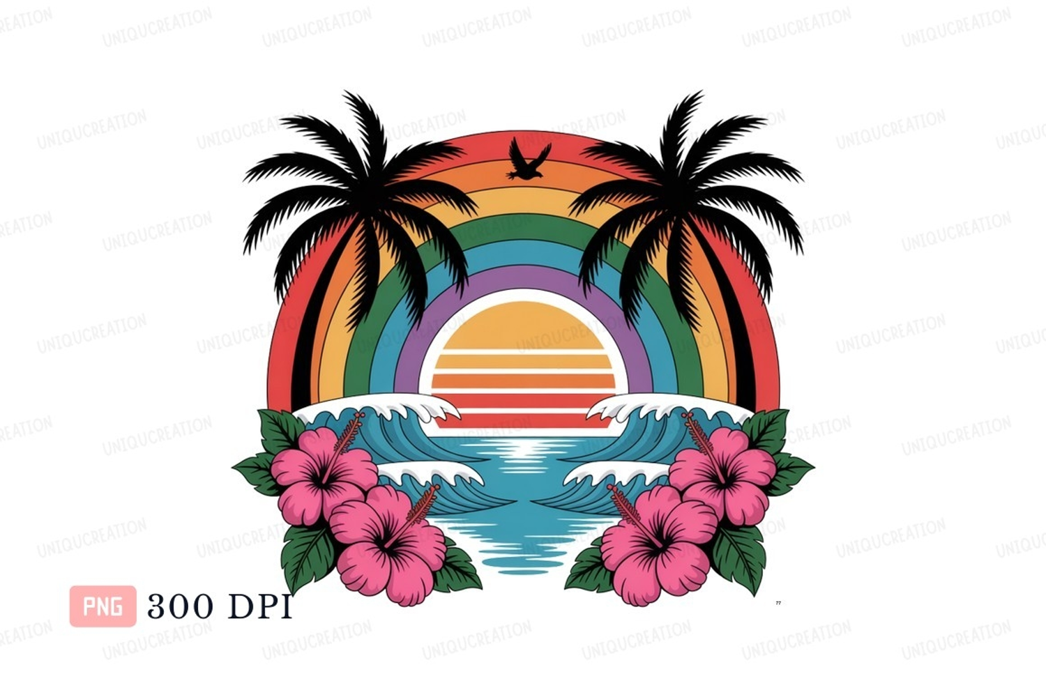 Vintage Retro Ocean Beach Sunset Hibiscus Tropical Clouds Palms Sky
