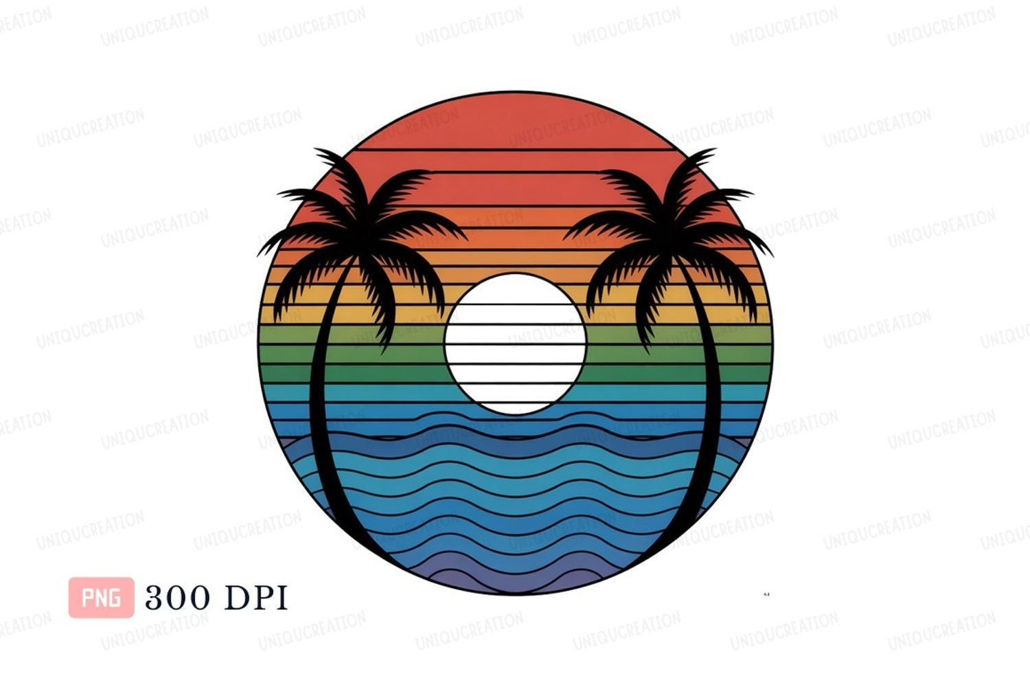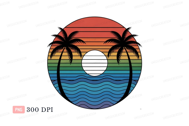 Vintage Retro Ocean Gradient Beach Sunset Tropical Trees Palm Waves