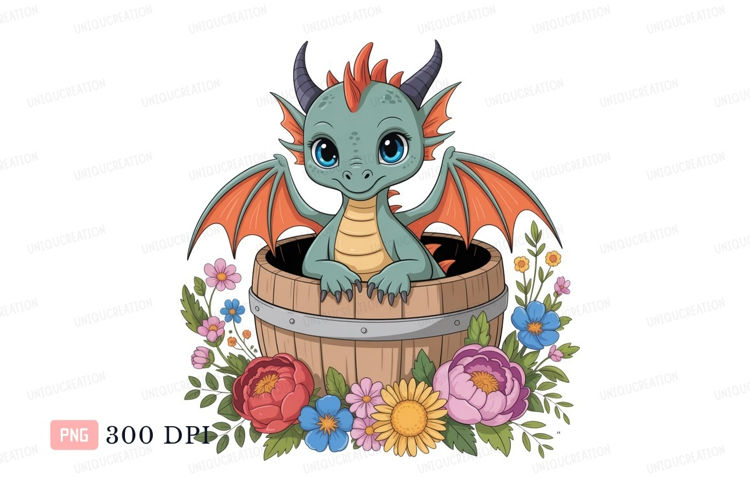 Cute dragon in barrel surrounded by flowers fantasy example image 1