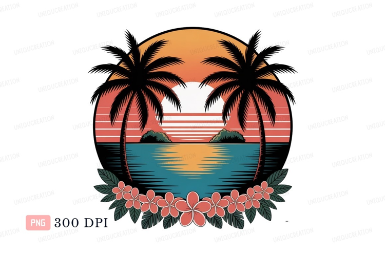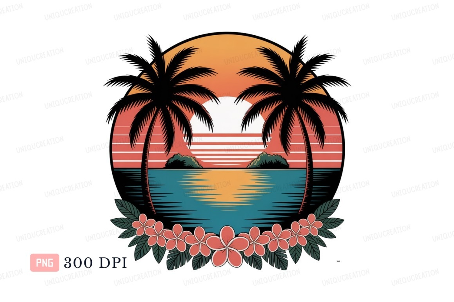 Vintage Retro Illustration Ocean Flowers Beach Sunset Tropical Island Palms