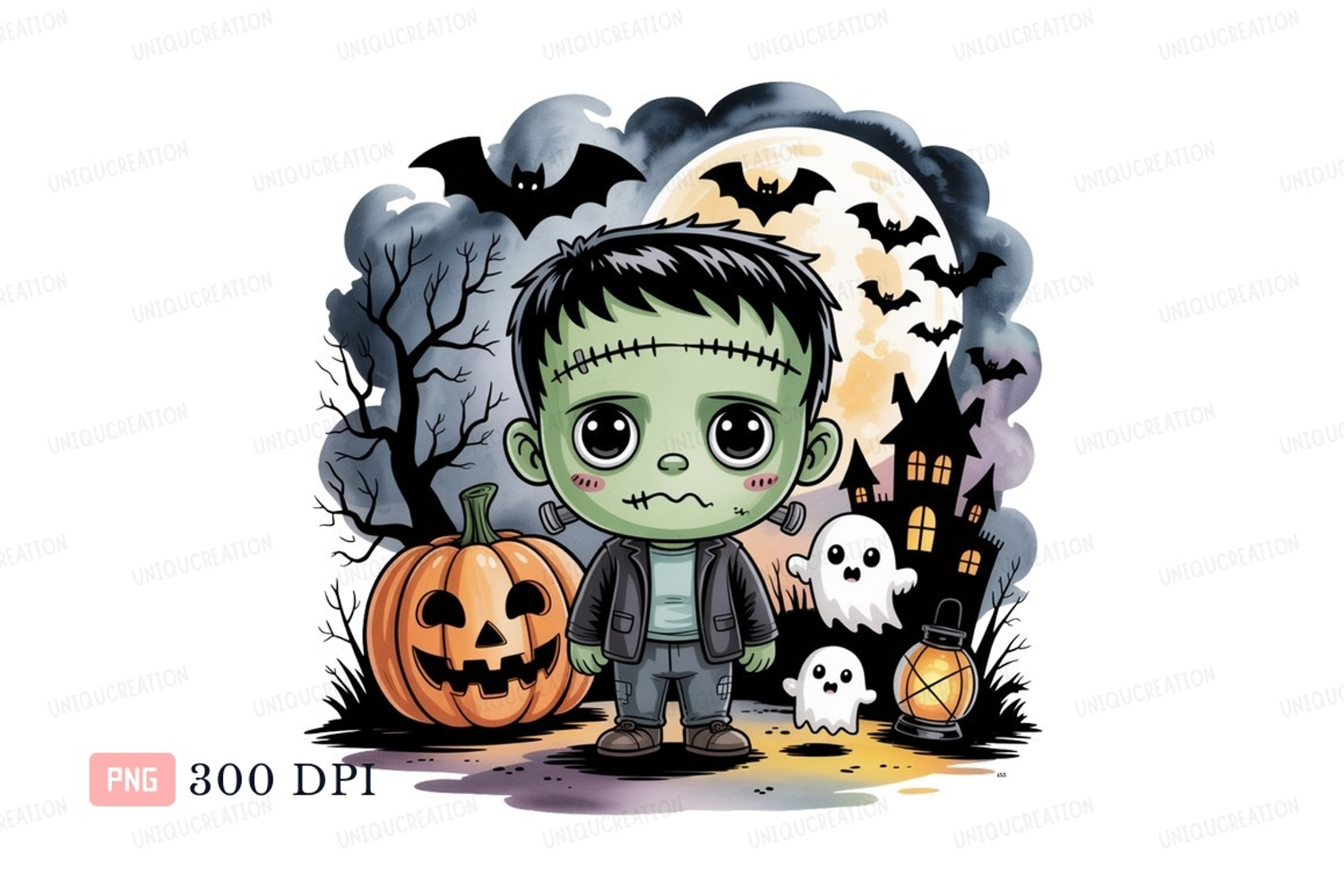 Cute Frankenstein character with pumpkin and ghosts example image 1