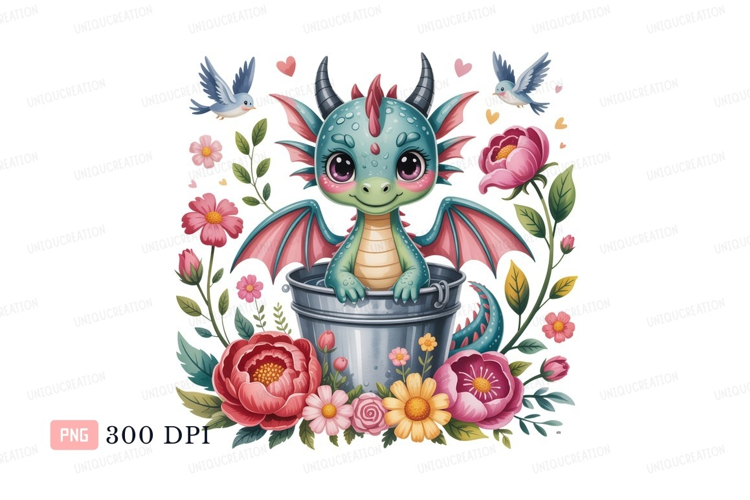 Cute dragon in bucket surrounded by flowers birds pink example image 1