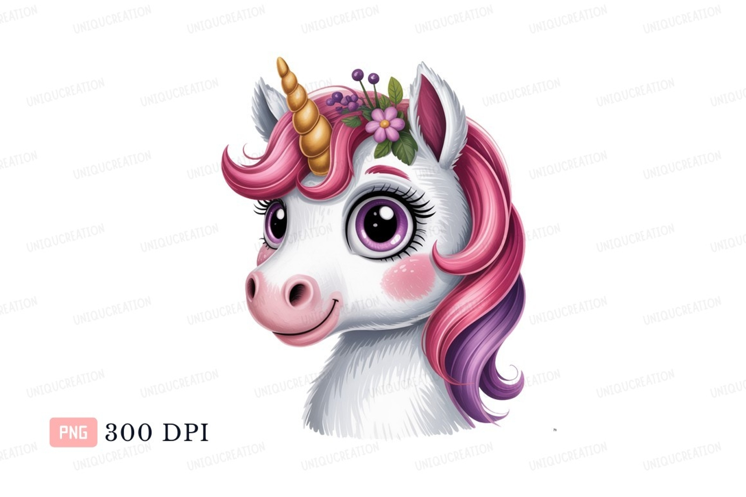 Adorable unicorn with pink mane and purple eyes fantasy example image 1