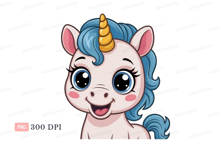 Adorable unicorn with blue mane and golden horn fantasy example image 1