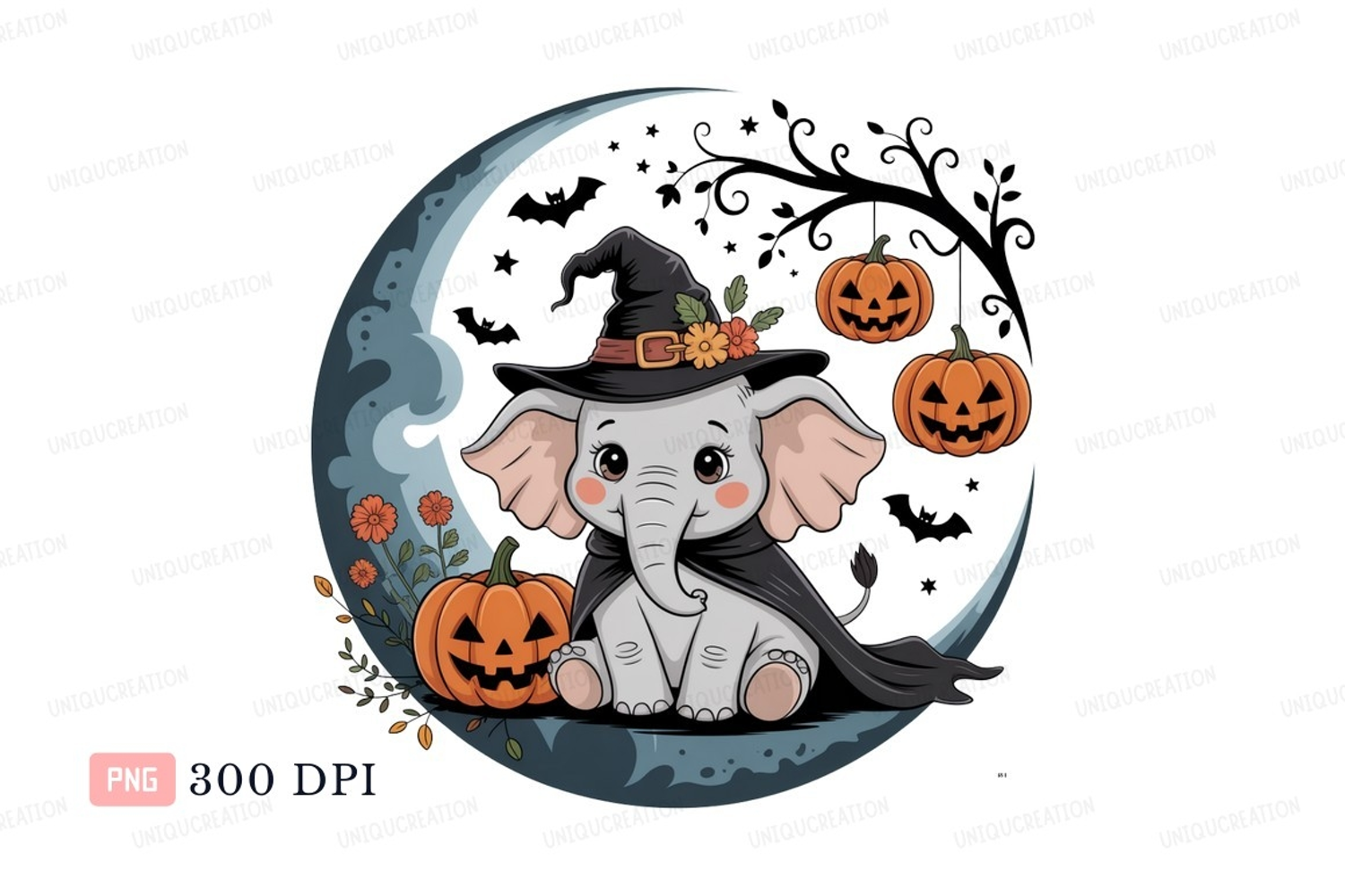 Similar Design Products to Cute elephant witch on moon with pumpkins image