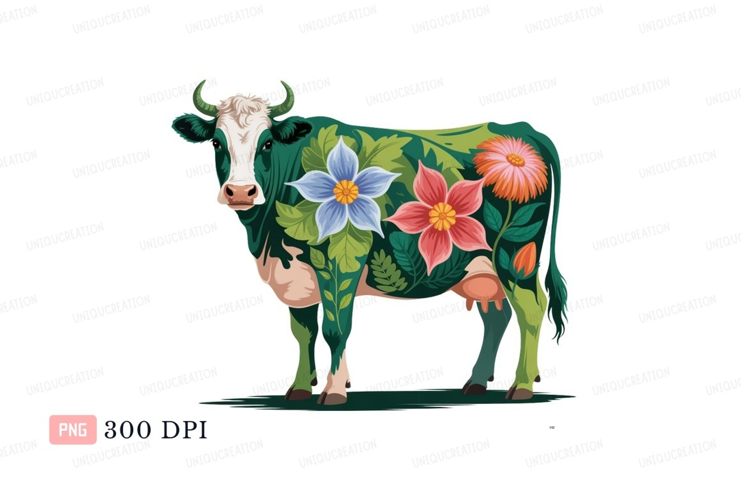 Similar Design Products to Green cow adorned with colorful flowers and leaves