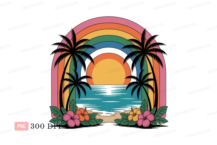 Vintage Retro Ocean Flowers Beach Sunset Hibiscus Tropical Rainbow Palms