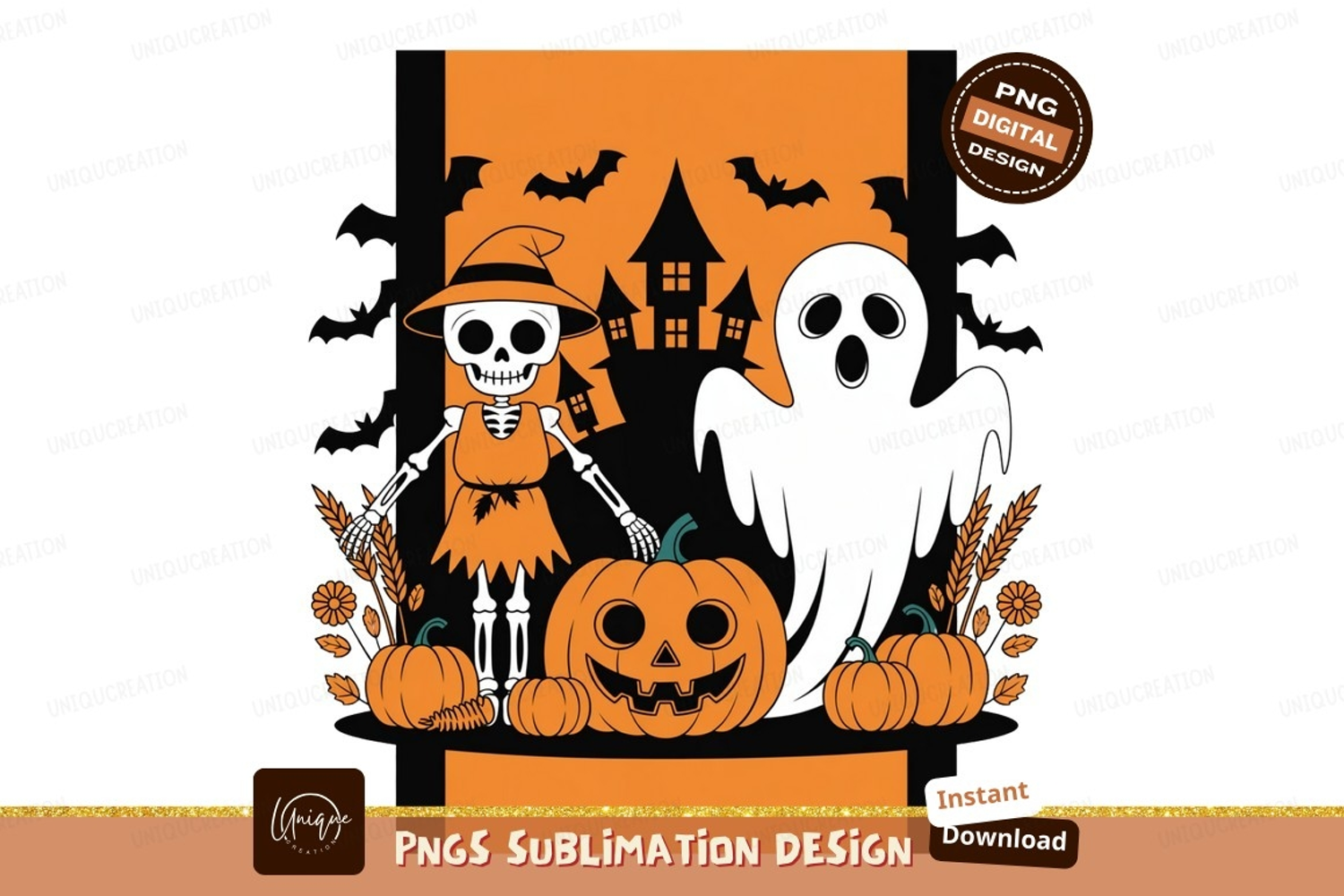 Skeleton ghost pumpkins haunted house bats halloween example image 1