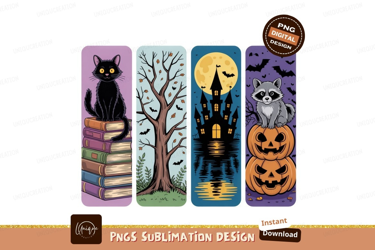 Black cat on books haunted castle and raccoon on pumpkins example image 1