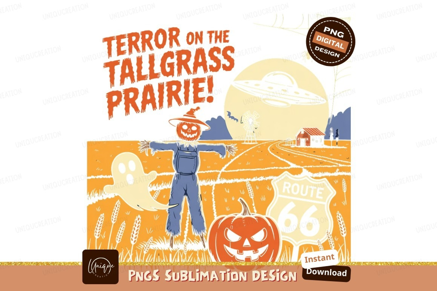 Halloween prairie scene with scarecrow ghost pumpkin U F O example image 1