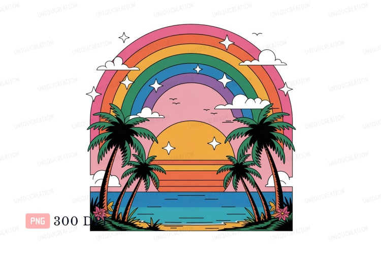 Pink Ocean Beach Sunset Tropical Trees Rainbow Clouds Palm Stars