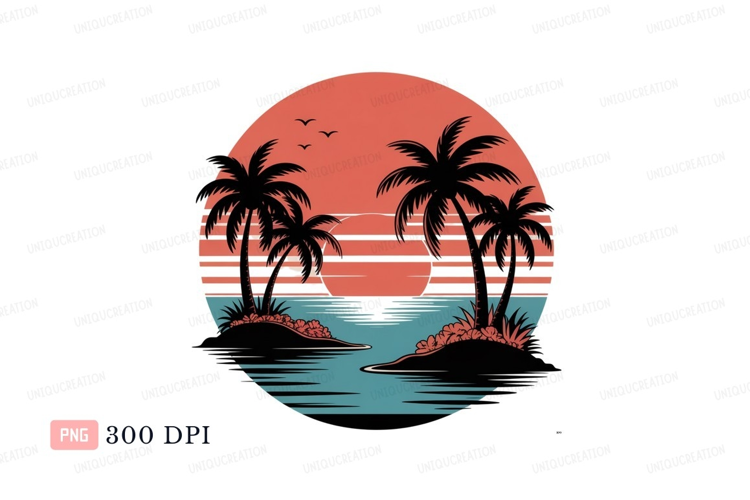 Retro Ocean Birds Water Sunset Tropical Trees Palm Sky Islands