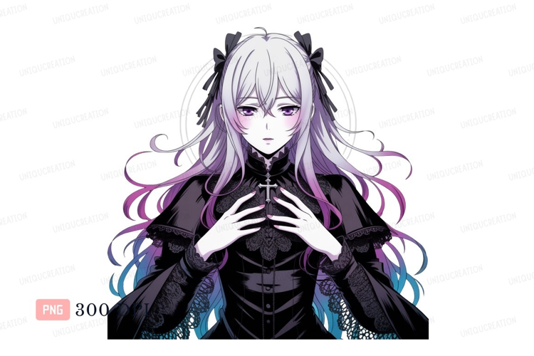 Gothic Black Girl Dress Purple Hair Cross White Lace Anime