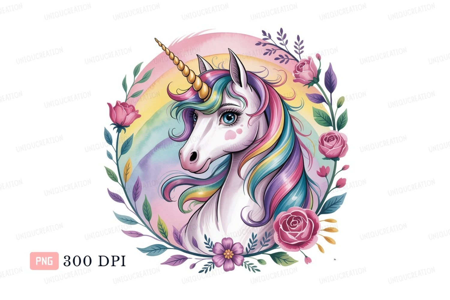 Unicorn with rainbow mane and floral wreath horse fantasy