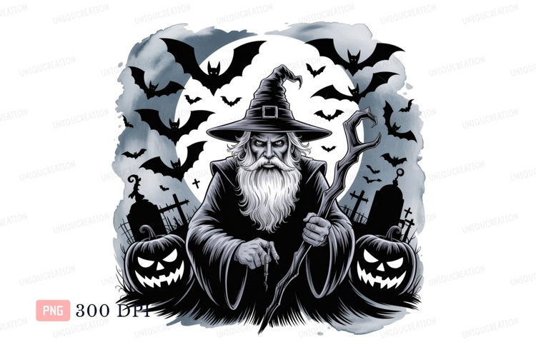 Grayscale wizard with staff and pumpkins bats graveyard example image 1