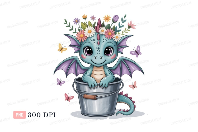 Baby dragon with flower crown in bucket cute fantasy example image 1