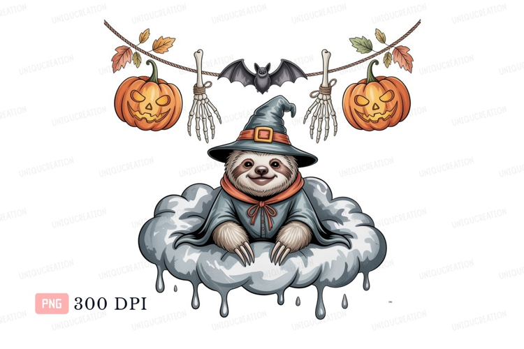 Sloth witch on cloud with pumpkins image example image 1