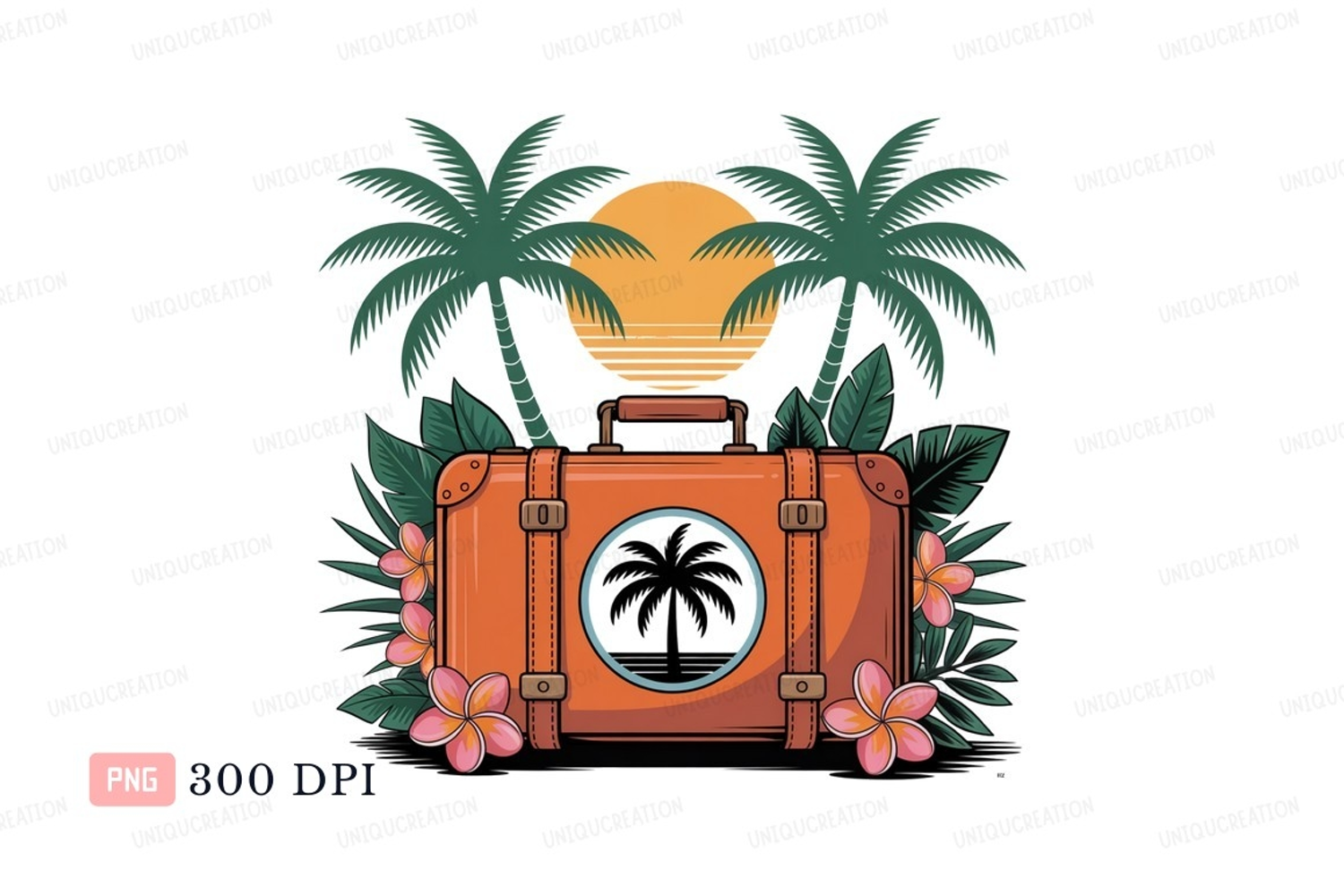 Orange suitcase tropical sunset palm trees flowers example image 1